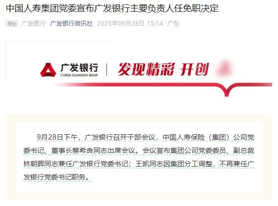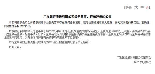 9月28日,广发银行官网发布公告显示,该行董事会于2025年9月28日收到王凯提交的书面辞呈。王凯因集团分工调整,请求辞去该行第十届董事会董事、副董事长、行长、董事会战略/消费者权益保护委员会主任委员等职务。