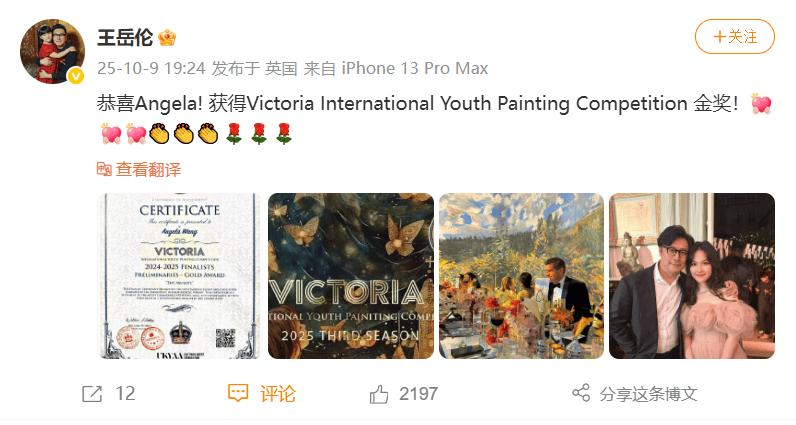 2025年10月9日牛股动力,李湘和王岳伦在社交平台发布了相同的内容,为女儿王诗龄(Angela)赢得“维多利亚国际青少年绘画大赛”金奖送上祝福。