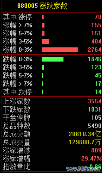 市场共3554只个股上涨,70只个股涨停,1831只个股下跌。